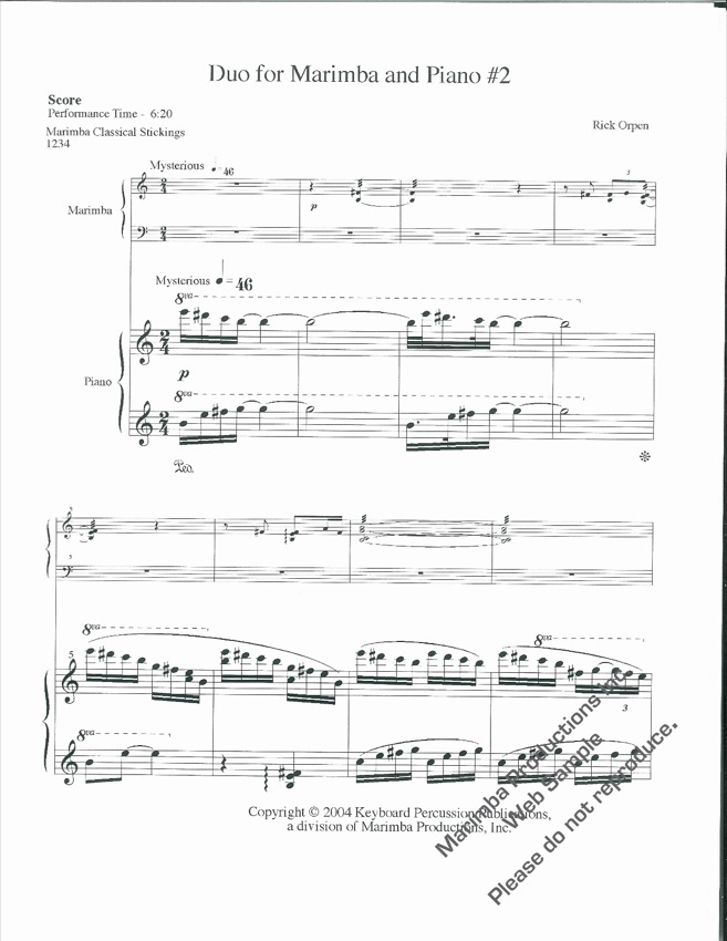 $25.00It is rare that the instrumental combination of two-mallet marimba and piano sounds like a serious piece of chamber music, but this new work by Rick Orpen belies the stereotype. This work is also substantial in length, filling almost ten minutes with interesting and challenging music.