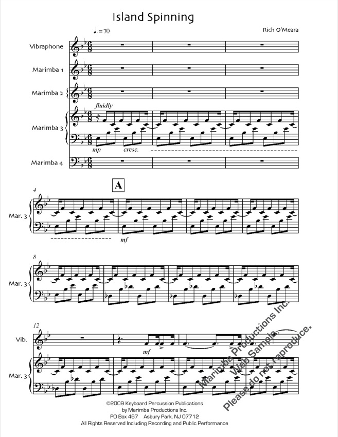 NOTE: “Island Spinning” is scored for five players on three marimbas (including one 5-octave) and vibraphone – Marimba 1 and Marimba 4 parts may be played on the same 5-octave marimba. For a different effect, the vibraphone part may be played on a marimba, with the longer notes (dotted quarter notes and above) performed as rolls.