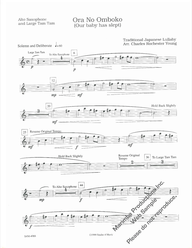 A traditional Japanese lullaby, arranged for alto saxophone (who also plays tam -tam), marimba (4 mallets) and percussion (crotales or glockenspiel, wood block, and triangle). ‘Ora No Omboko’s’ delicate textures and haunting melodic material make a lovely change of pace for any performance situation. The piece also provides excellent small ensemble experience for the intermediate marimbist and percussionist.