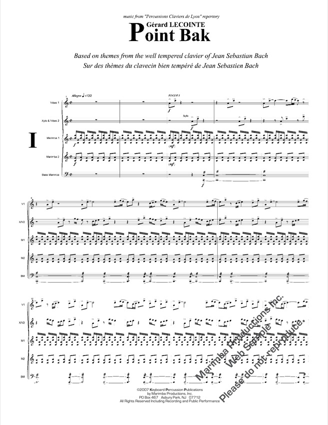 Movement I has a thick texture with many repeated notes in the marimba parts. The vibes and xylophone play fragments from the first fugue and later the second prelude and second fugue. The second movement is Andante and quite lovely, featuring melodies from preludes III and VIII. The third movement begins with a transition section based on the 17th prelude, and then moves to an adagio section with material from prelude VI. Cymbals and tam-tam are used here to excellent effect. The piece concludes with movement IV, beginning with fragments from prelude V, fugue III and preludes XXI and XXII. After a moderate opening, it soon changes to a rollicking and playful section based on material from prelude X. Running sixteenth-note passages continue throughout the movement, finally giving way to a concluding section at a more moderate tempo based on prelude I material.