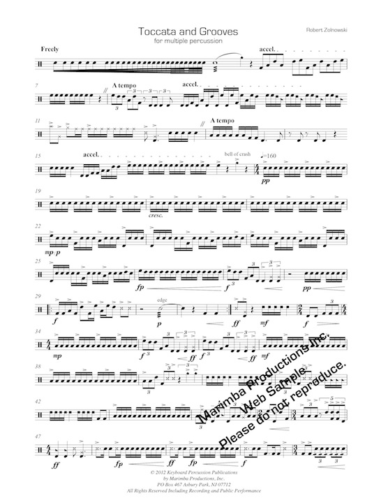 Toccata and Grooves is a multiple percussion piece that portrays a percussionist walking into a practice room and jamming in a multi-genre drum set and/or drum corps style on someone else’s set-up. The first few phrases represent the performer becoming acclimated to the set-up and then continuing to jam in different styles. The piece is intended ?to sound like an improvisatory performance.